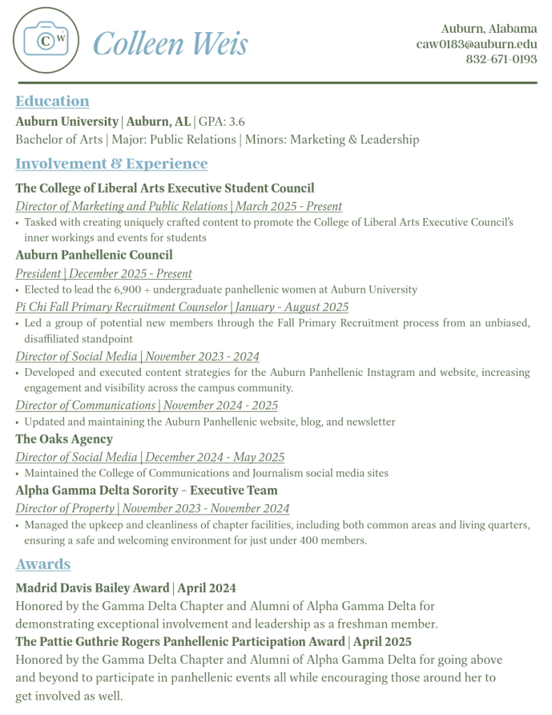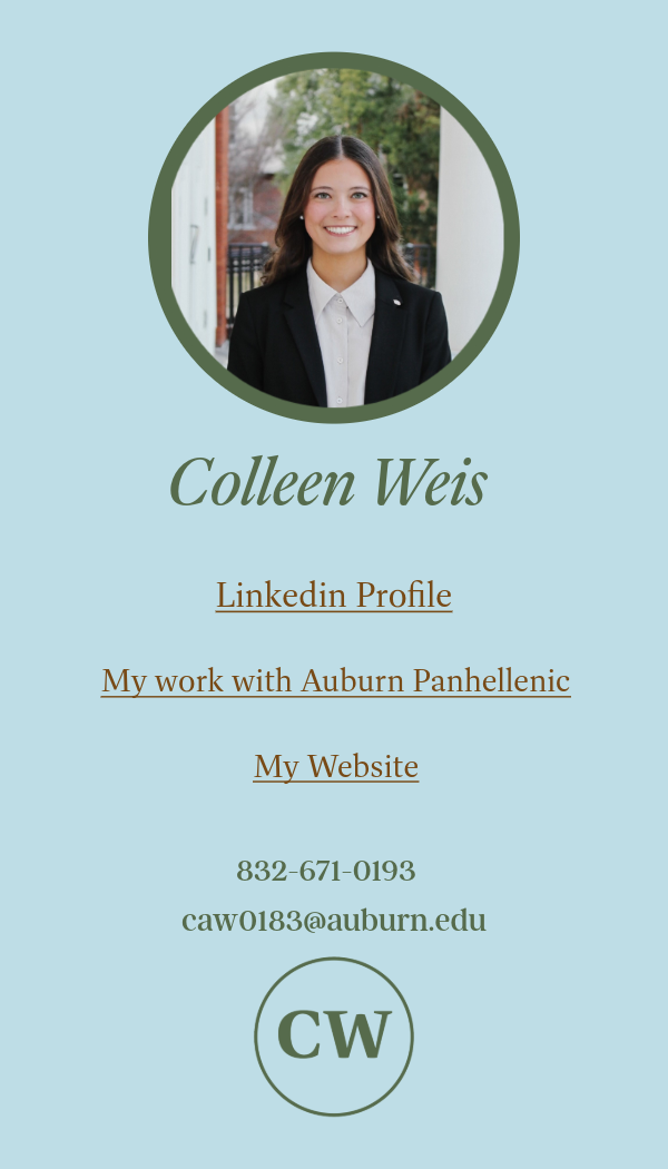 When creating my digital business card I knew I wanted to use it as an oppurtunity to bring more color in from my brand kit. I went for a vertical approach and included my headshot as well as one of my alternative logos to switch things up. The more simple logo goes well on this design because of how much information is placed on such a small space. I included clickable links that can take viewers to my LinkedIn profile, my work featured on the Auburn Panhellenic website, and this portfolio website.