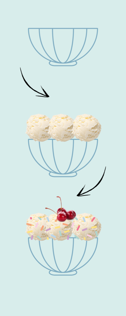 For this challenge we were tasked with creating an infographic with no words present in our design. My table in class was given “How to Make an Ice Cream Sundae” as our prompt, and we were all tasked with creating our own unique design to create this concept to the rest of our class.