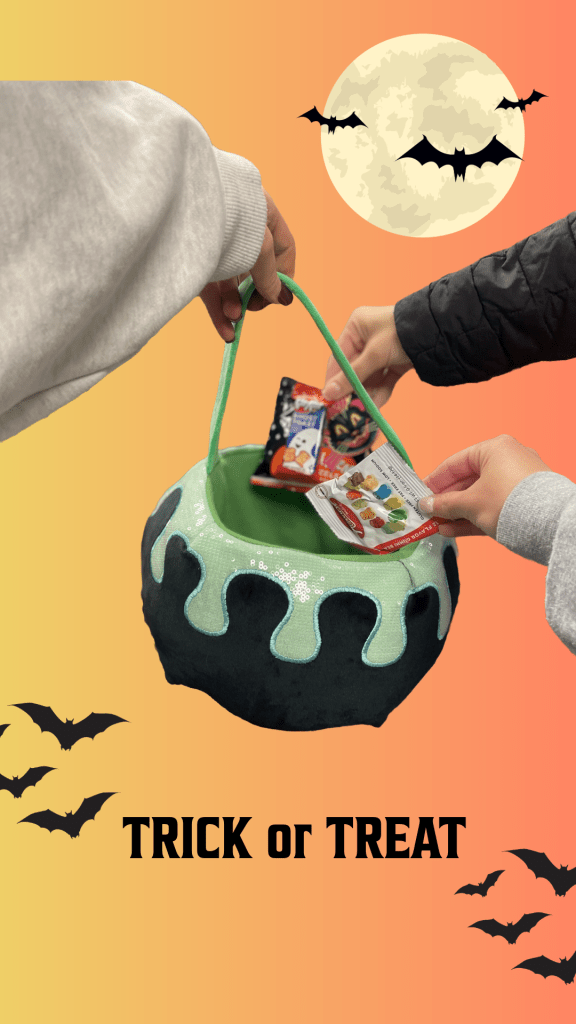 For this activity we were sorted into randomized groups in class and were given a prompt to use as a basis for our design. My groups theme was “Nostalgia and Fun.” We then used props and candy provided to capture the perfect Halloween photo to use within our designs. My group used our props to create the image seen pictured in my design. We then each separately created our own designs using Adobe Express.